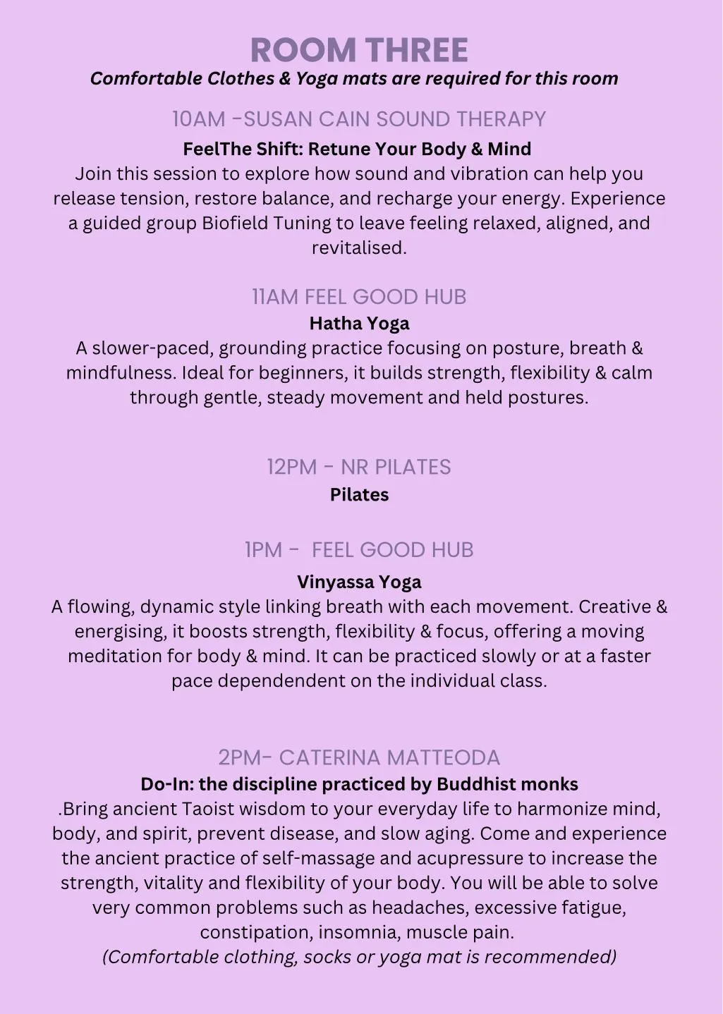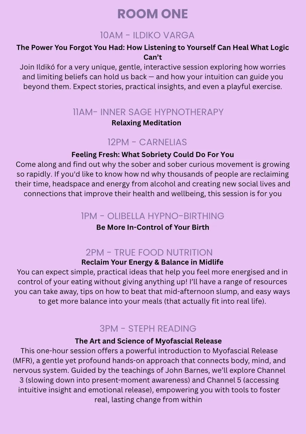 Your ticket gives you access to the event, where you’ll find over 45 stalls with wellness products, tasters, and experiences, plus the chance to attend inspiring talks and workshops throughout the day. Some workshops may have limited capacity—arrive early to secure your spot.